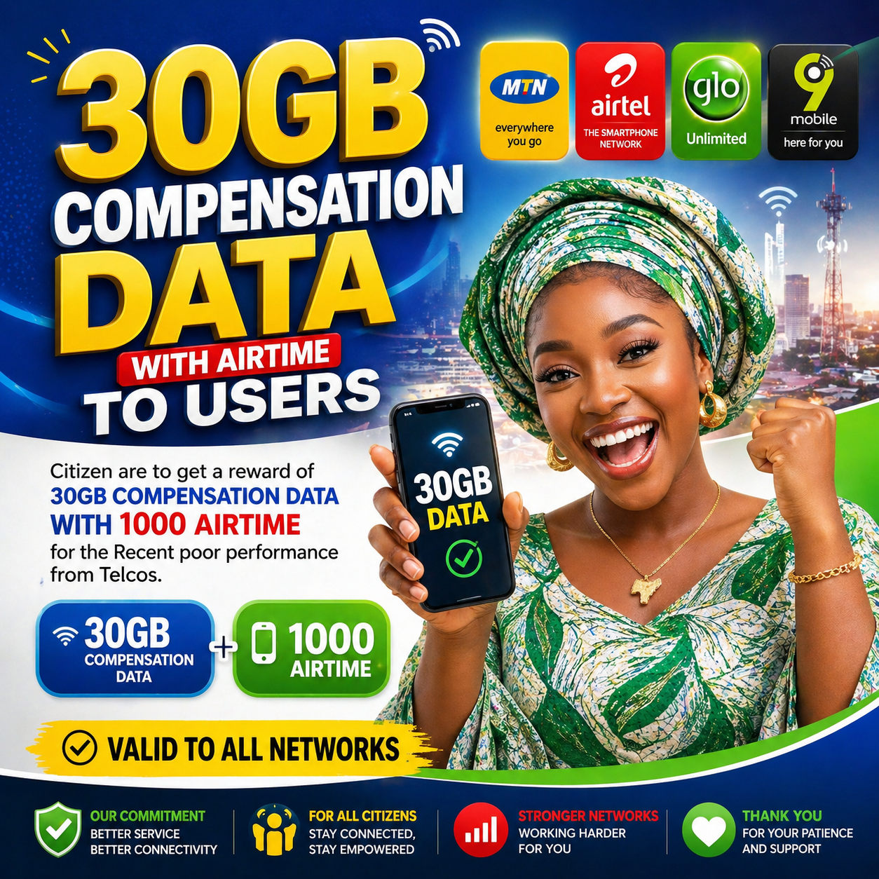 In Compensation for the Poor Network, Telcos is giving a data reward of 30GB with 1000 Airtime. Click the link below and Enter your Mobile Number to get yours